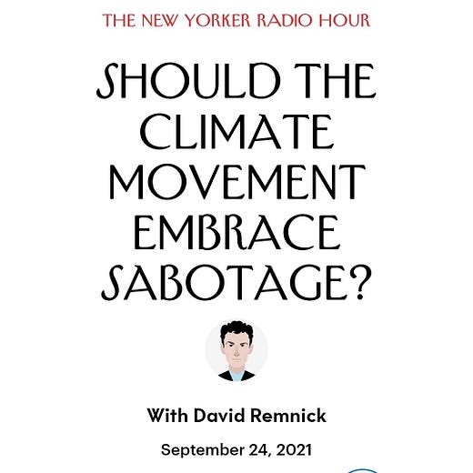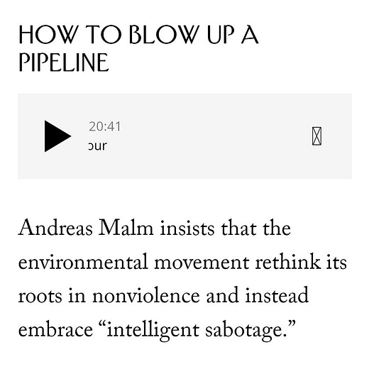 Late last Saturday night, I ran across a New Yorker podcast entitled “Should the Climate Movement Embrace Sabotage?” The podcast included an interview with Professor Andreas Malm, a Swedish author and lecturer at Lund University. The podcast description described Malm as someone “who studies the relationship between climate change and capitalism, insists that the environmental movement reconsider its roots in nonviolence.” To that end, Malm has written a book: “How to Blow up a Pipeline.”