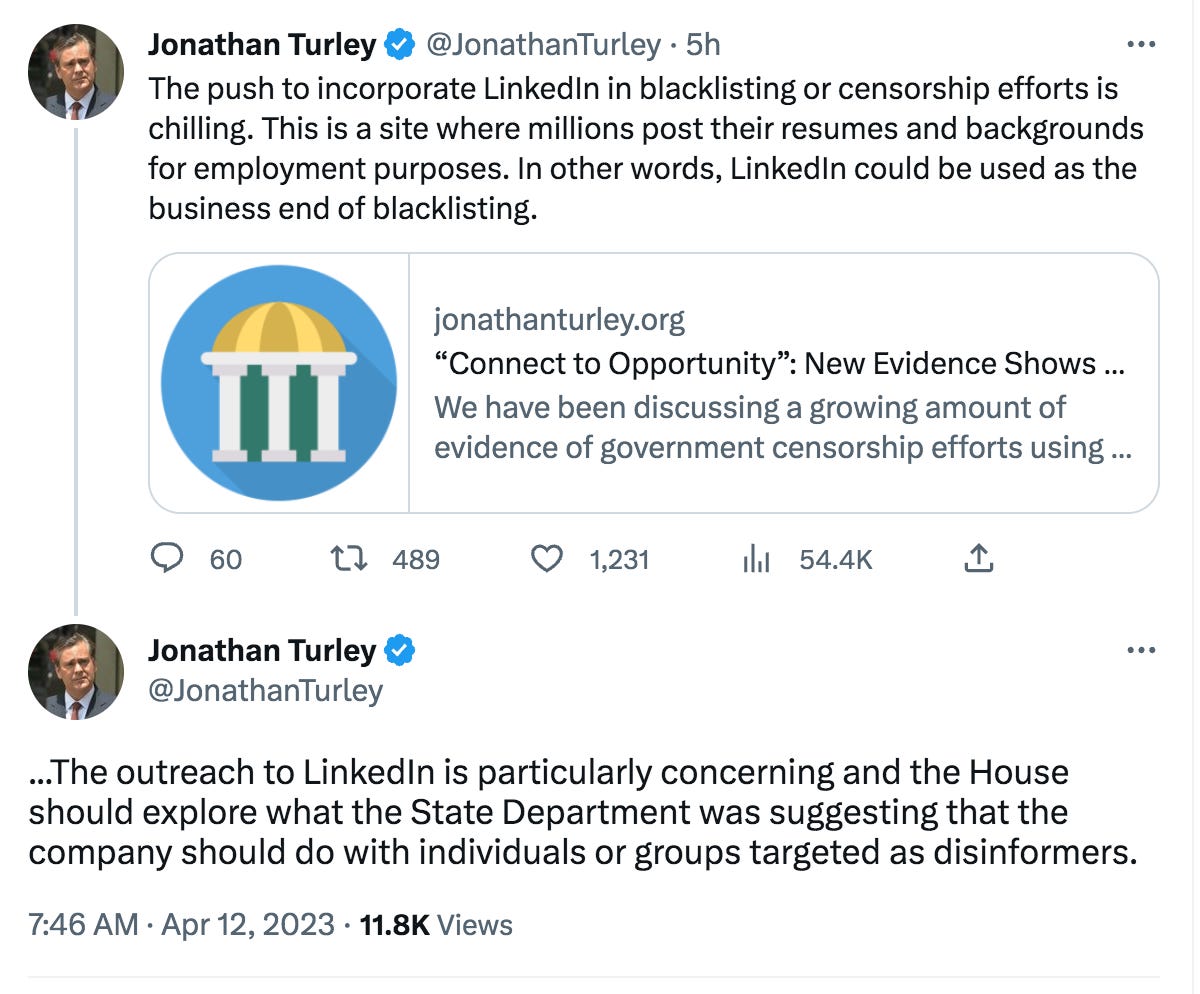 Via Jonathan Turley, word that the State Department attempted to establish a relationship with LinkedIn as part of the effort to “fight disinformation”: