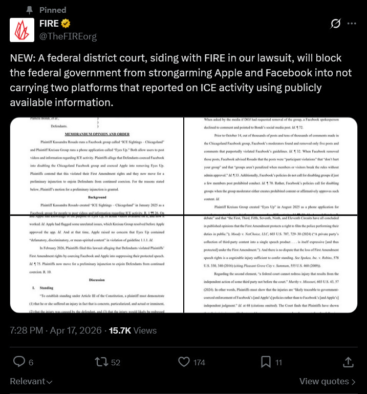 The federal government tried to prevent Apple and Facebook from carrying apps that report the activity of Immigration and Customs Enforcement (ICE). The Foundation for Individual Rights and Expression (FIRE) filed suit on the platforms’ behalf—and won.