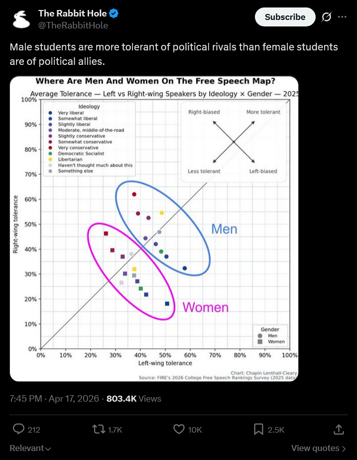 Recent survey data shows that overall tolerance for opposing political views is low among both male and female college students. But men generally display greater tolerance for their political rivals than women do for their political allies.