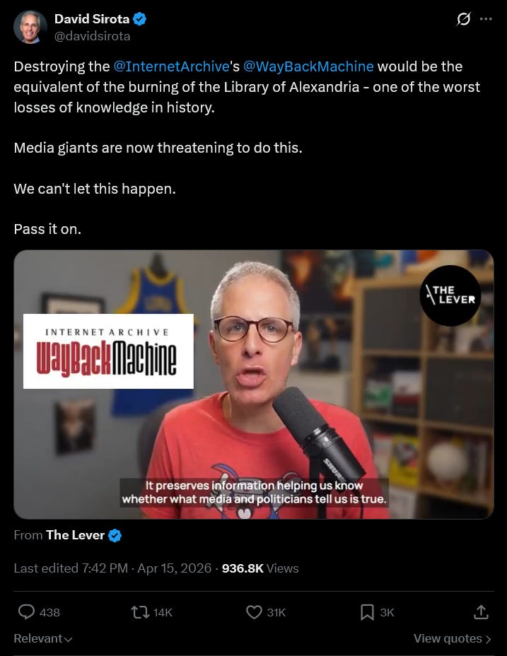 The Internet Archive’s Wayback Machine is an invaluable tool for preserving and accessing content. If major media corporations get their way, the site will disappear.