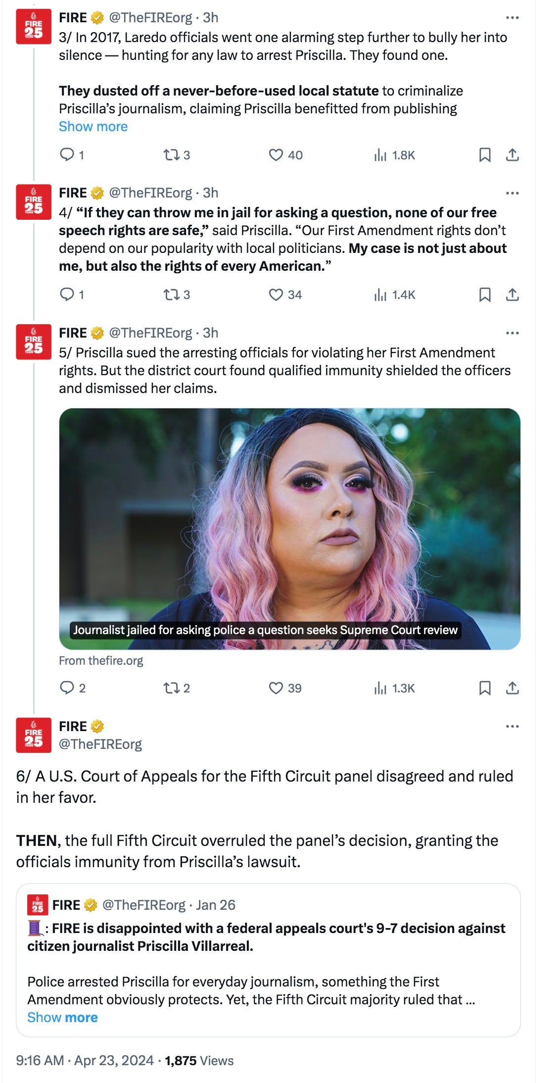 Pluribus has covered the case of Texan Priscilla Villarreal in the past, but the Foundation for Individual Rights & Expression is now committing to bring Villarreal’s case to the highest court in the land. Excerpts of longer thread follow: