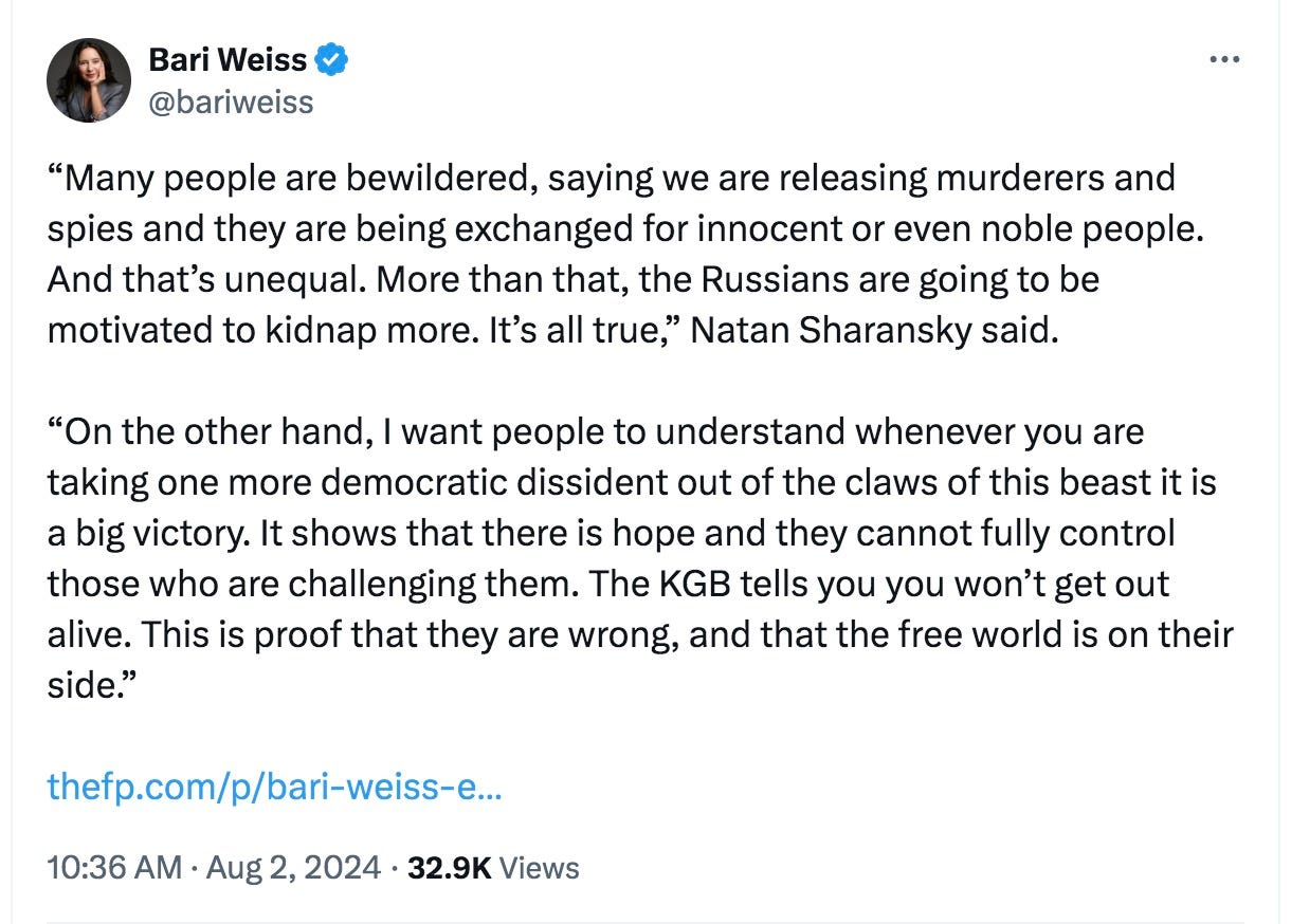 Via Bari Weiss, here’s some perspective from gulag survivor Natan Sharansky on the deal with Russia that freed Evan Gershkovich and others: