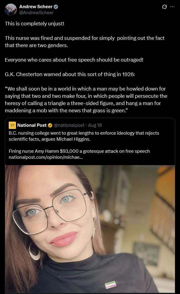 Meanwhile in Canada, the British Columbia College of Nurses and Midwives just suspended Amy Hamm and ordered her to pay nearly $94,000 in legal fees. What sort of malpractice did nurse Hamm, a single mother with an exemplary work record, commit? She posted wrongthink on social media. Michael Higgins calls shenanigans in The National Post: