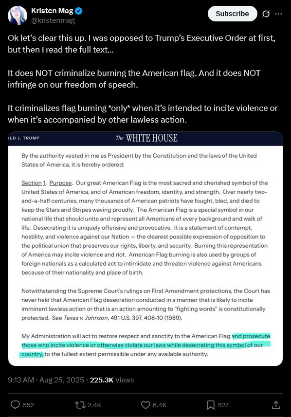 Kristen Mag urges critics of the flag-burning executive order to pump the breaks. The order is more narrow than many people originally assumed.