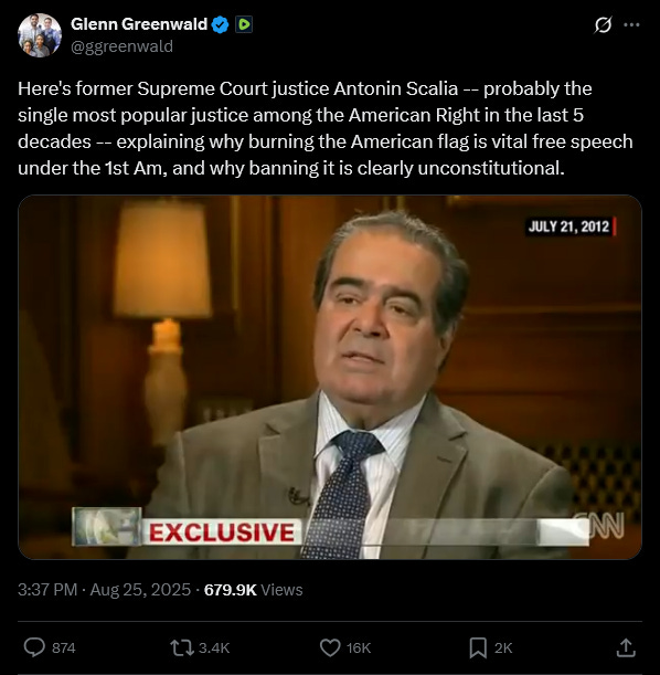 Flag-burning bans are often portrayed as a conservative cause. Glenn Greenwald reminds us that one of the titans of conservatism, Supreme Court Justice Antonin Scalia, viewed flag burning as protected speech.