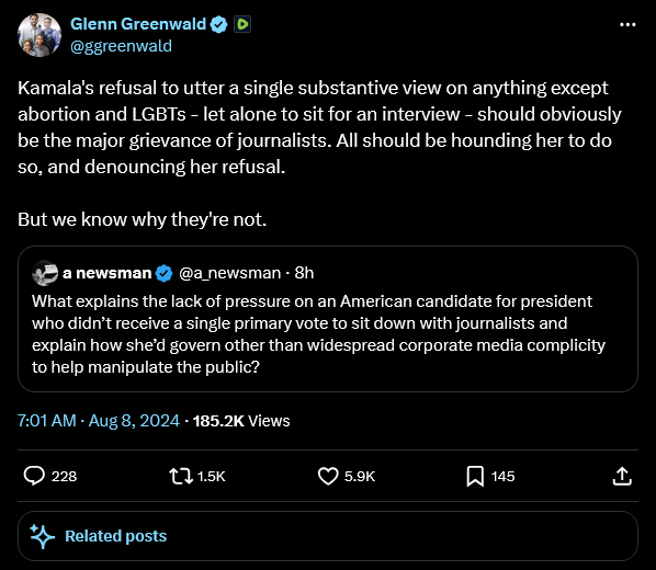 Finally, Glenn Greenwald says Kamala Harris owes voters some answers about her policy positions, and chastises the media for failing to hold her feet to the fire: