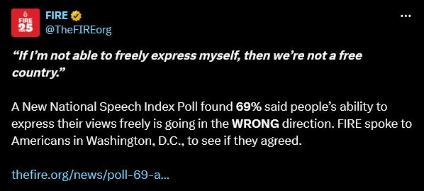 FIRE reports that a majority of Americans fears the US is going in the wrong direction when it comes to free speech (click for video):