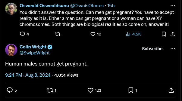 Finally, evolutionary biologist Colin Wright reassures a troubled follower that, in fact, only women can get pregnant: