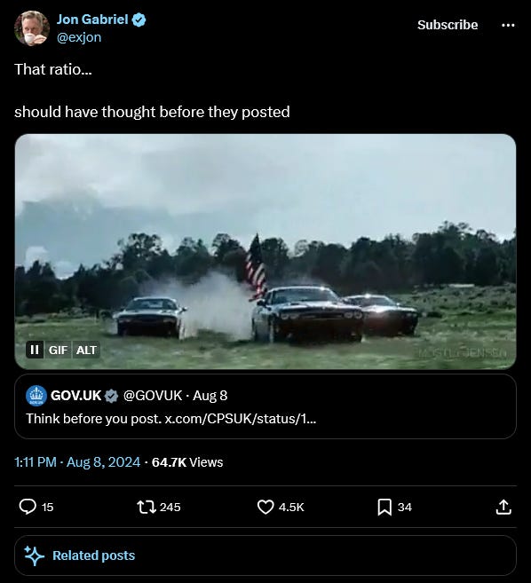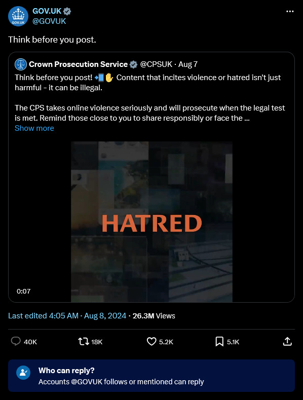 The UK government informed its citizens earlier this week that they should “think before” they post on social media, lest they be punished for spreading harmful wrong think. Unsurprisingly, the Twitter masses found this contemptible: