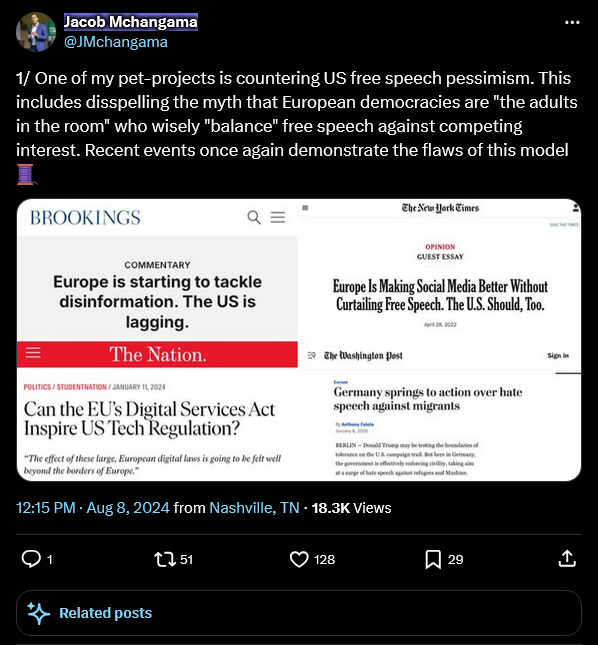 Some American political commentators believe that Europe takes a more sensible approach to speech regulation. Jacob Mchangama is here to disabuse them of that foolish notion (full thread here):