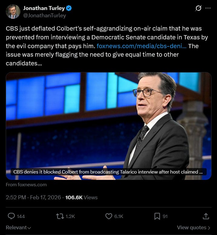 Jonathan Turley doesn’t buy Colbert’s censorship accusation against his employer, CBS.