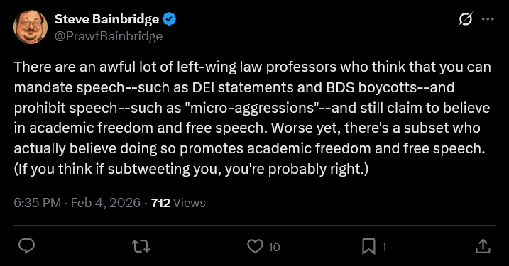 It’s nonsensical to defend academic freedom while mandating or prohibiting certain kinds of expression, argues law professor Steve Bainbridge.