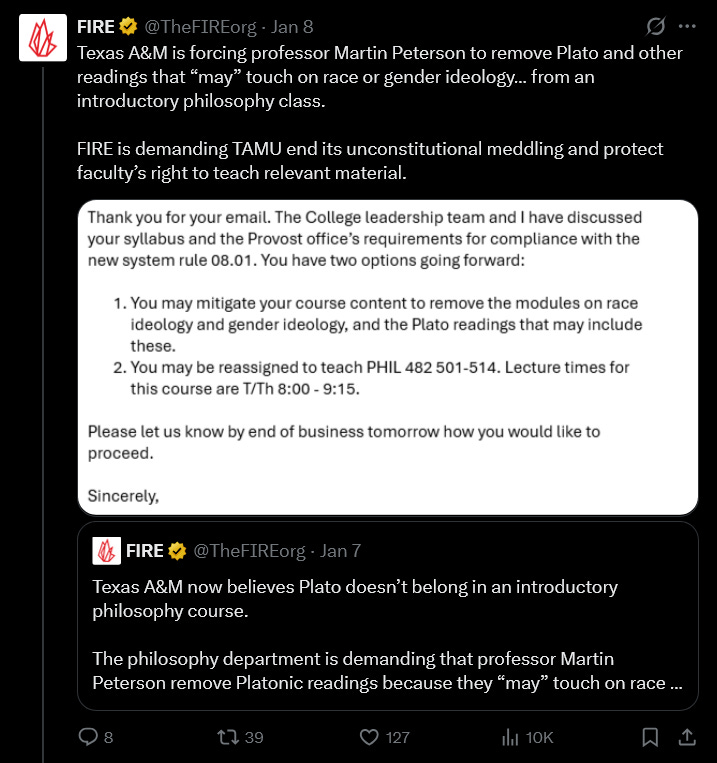 The Foundations for Individual Rights and Expression (FIRE) goes to bat for a a Texas A&M professor who’s been pressured to remove Plato from his intro to philosophy course.
