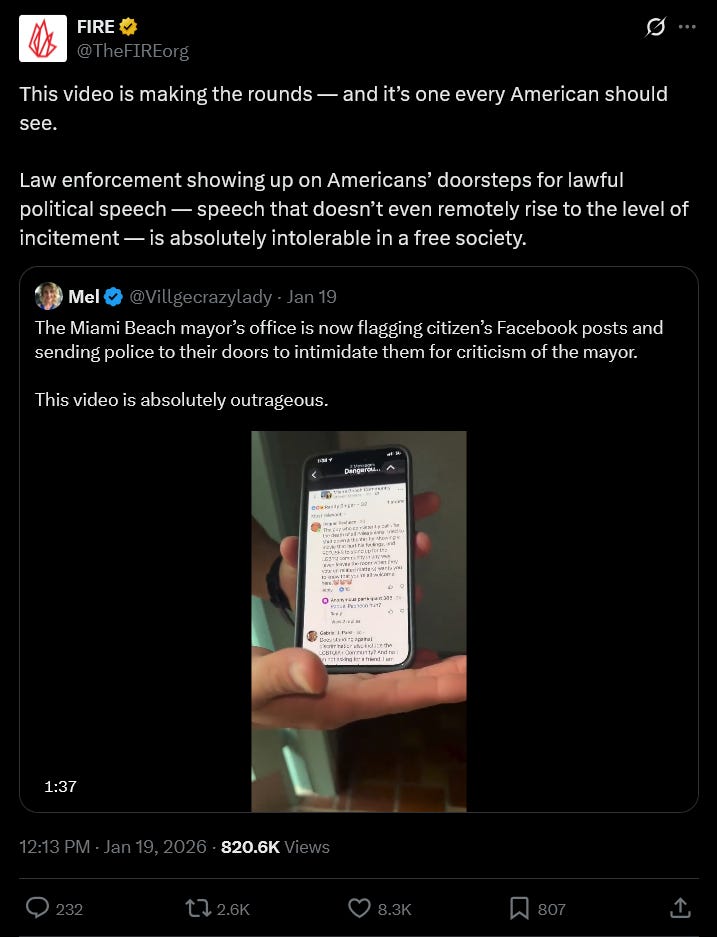 A perplexing video, to say the least, amplified by The Foundation for Individual Rights and Expression (FIRE). Lawful political speech, by definition, is not illegal.
