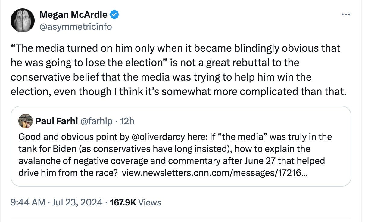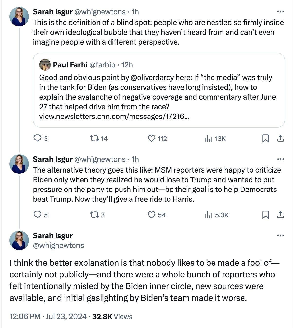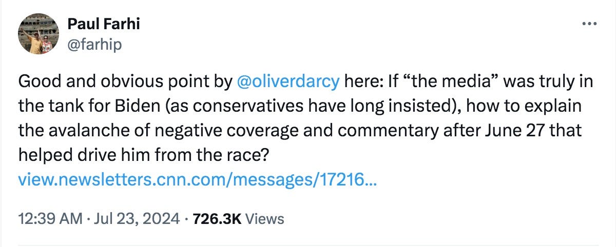 Paul Farhi, formerly of the Washington Post, has a theory about alleged complicity of the media in hiding Joe Biden’s true condition. Not everyone is buying it.