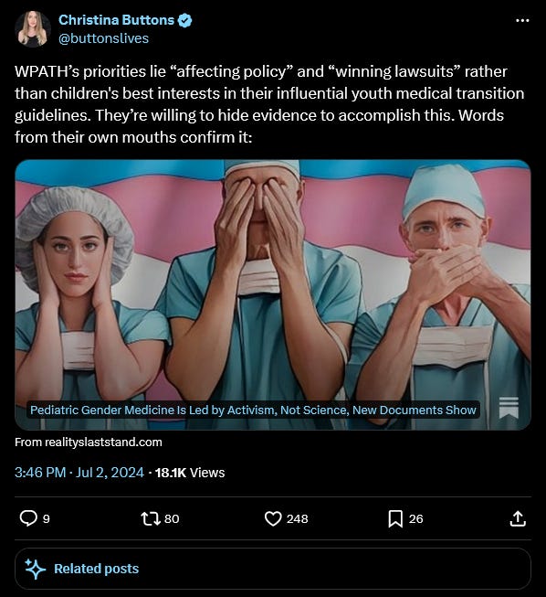 Christina Buttons says the campaign for youth gender medicine is driven by activism rather than science, according to the activists themselves: