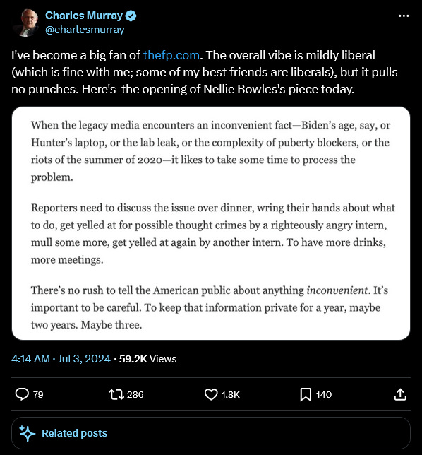 Finally, Charles Murray explains the source of his admiration for the Free Press: they don’t shy away from criticizing the media as necessary, a practice we at Pluribus also admire: