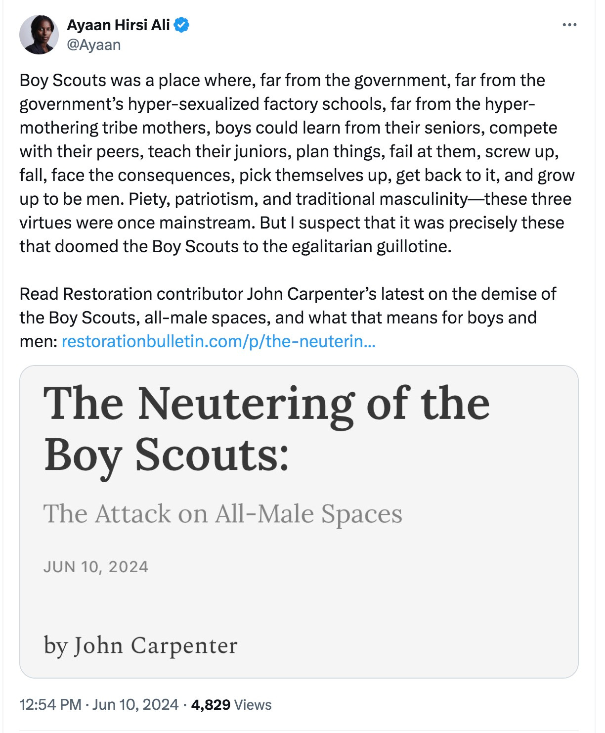 Ayaan Hirsi Ali welcomes John Carpenter to her new Restoration site with an essay about the Boy Scouts and disappearing male-only opportunities: