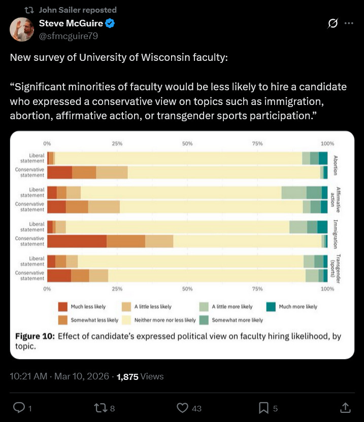 Steve McGuire highlights a concerning poll from the University of Wisconsin. If the results are any indication, dissent from the political orthodoxy on campus is still discouraged.