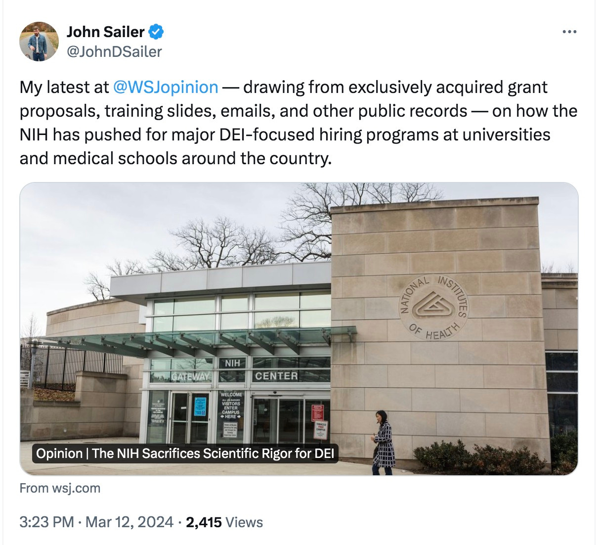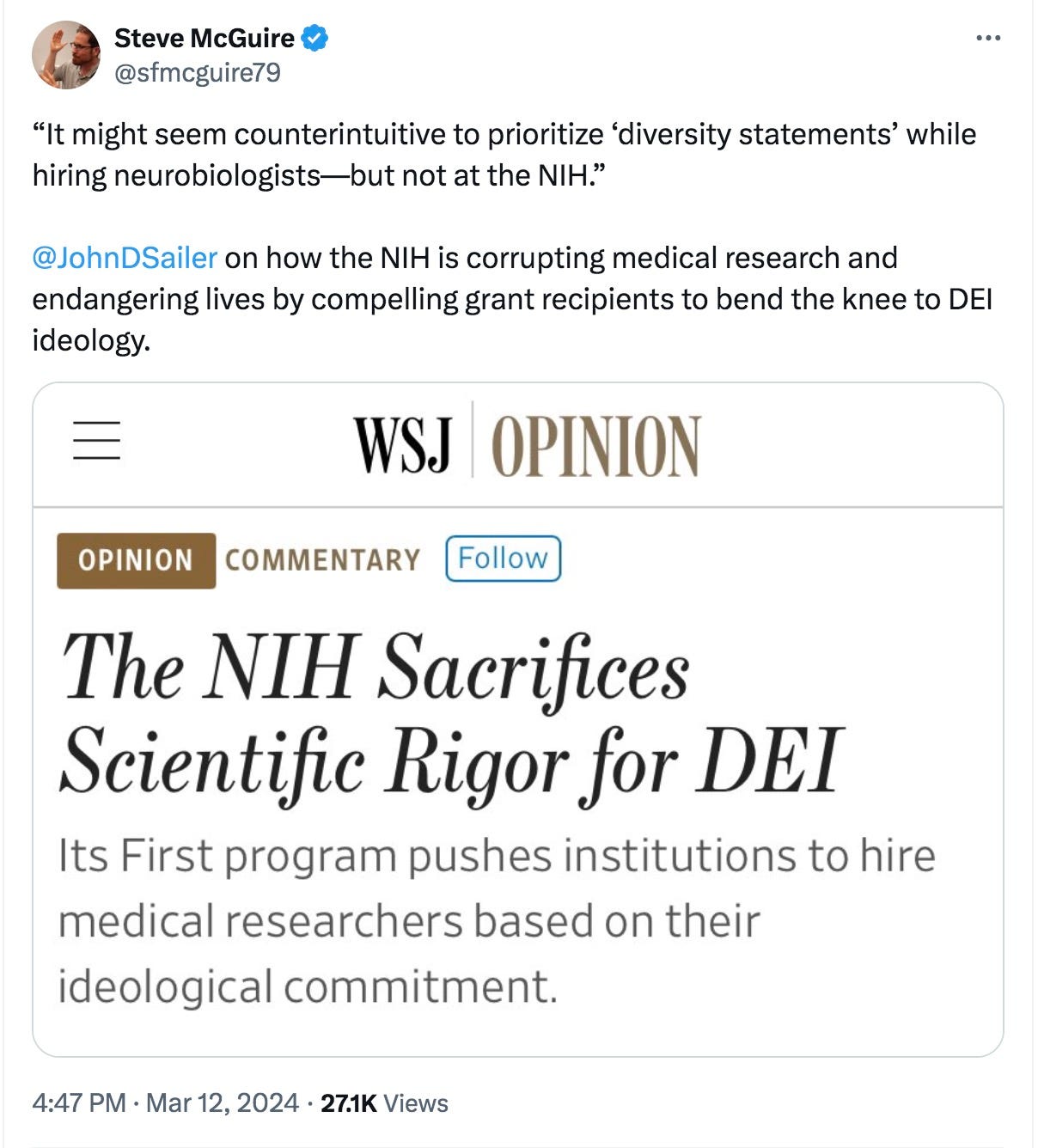 John Sailer goes after the National Institutes of Health in the Wall Street Journal for subjugating science to ideology: