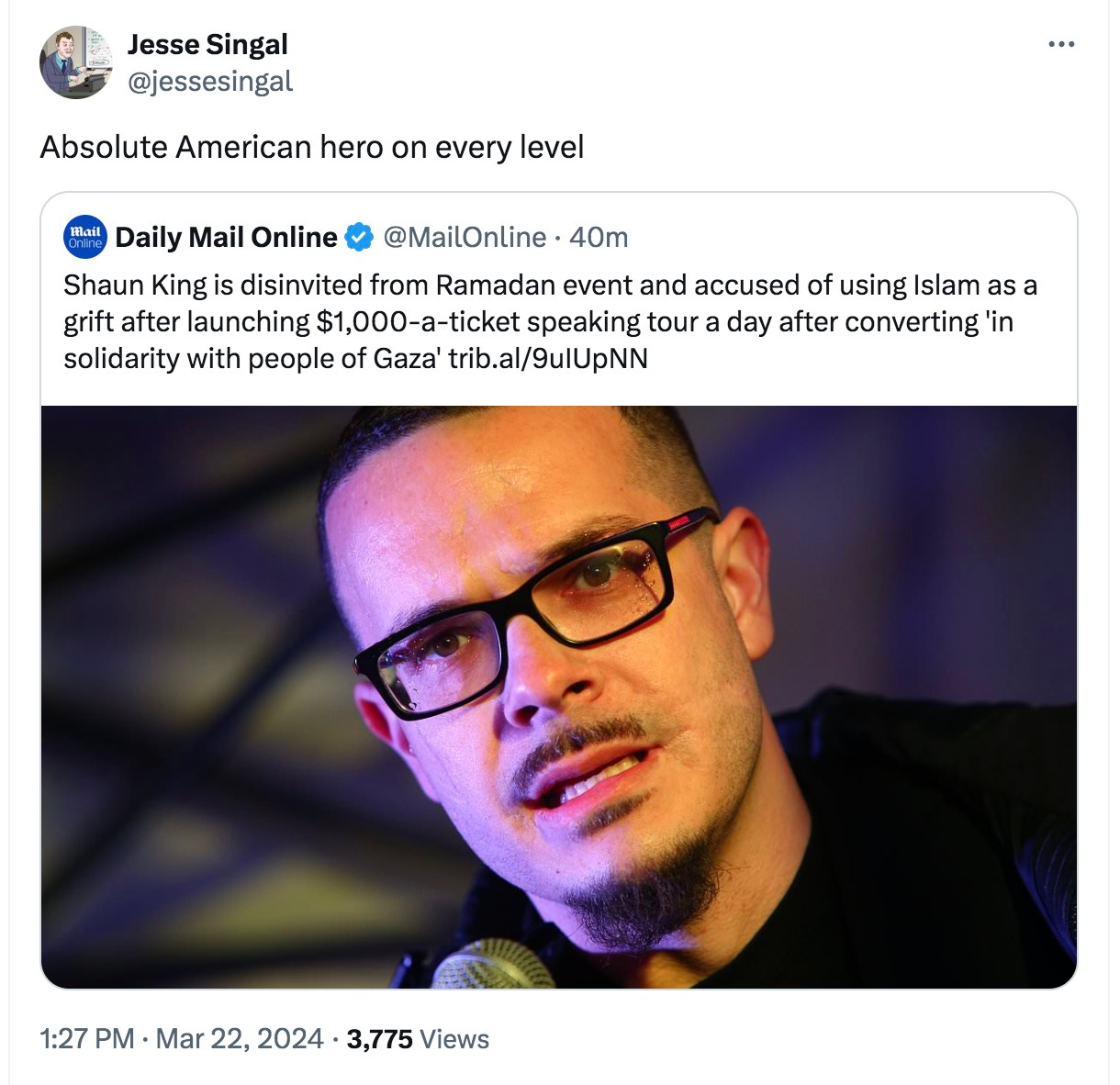 And finally, Jesse Singal brings to us the hero we didn’t know we needed: Shaun King!