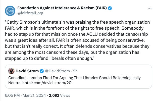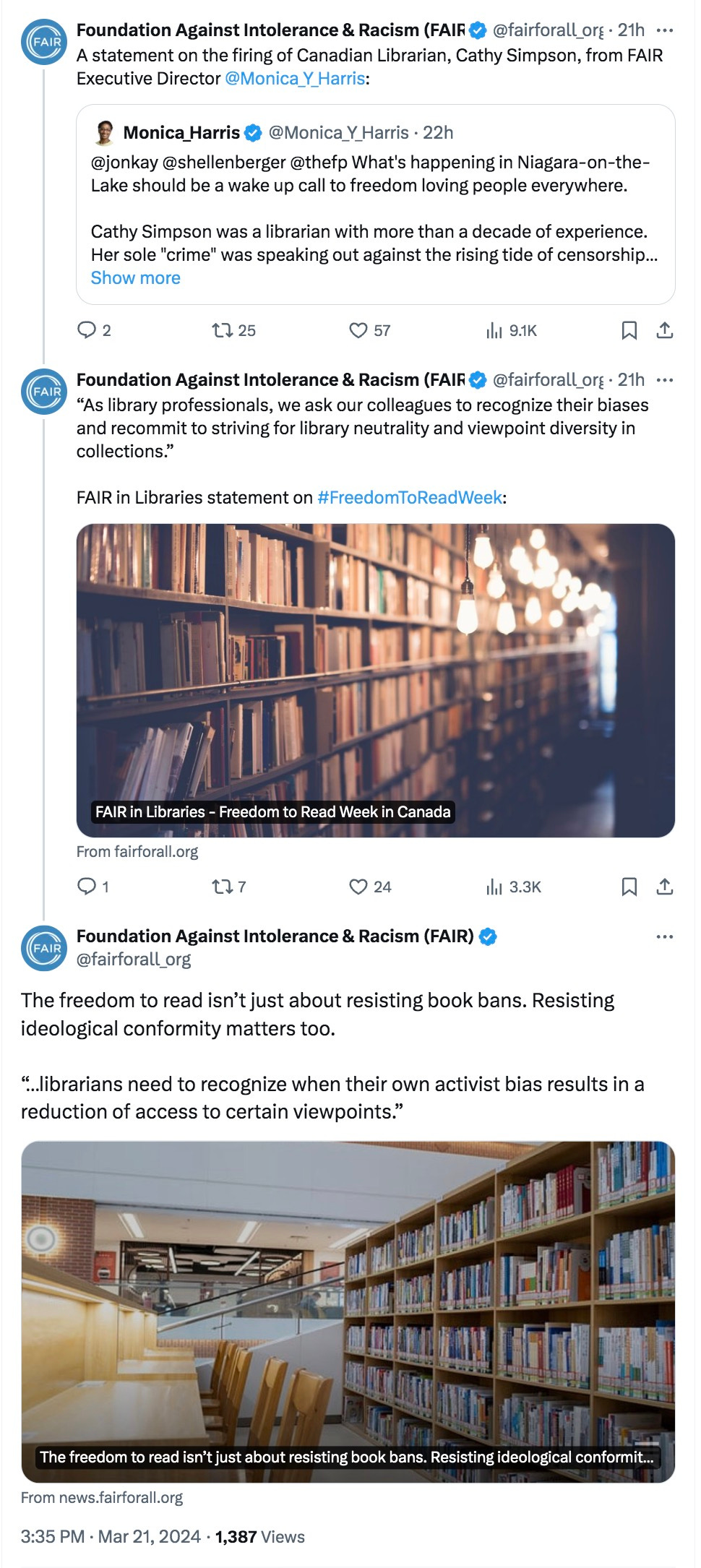 From Canada, a librarian is fired for… praising the Foundation Against Intolerance & Racism?