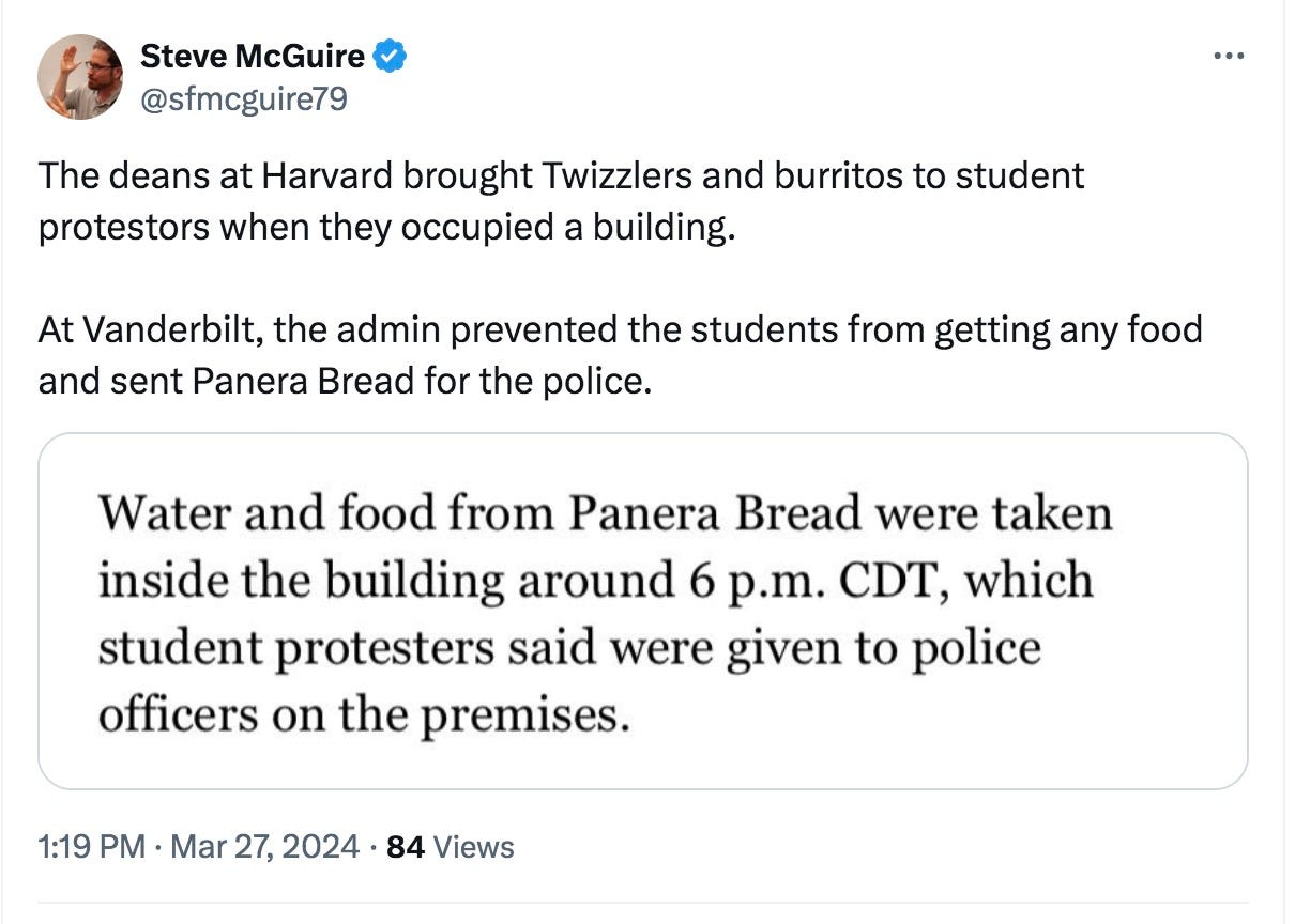 Via Steve McGuire, Harvard versus Vanderbilt handling student protestors occupying school buildings:
