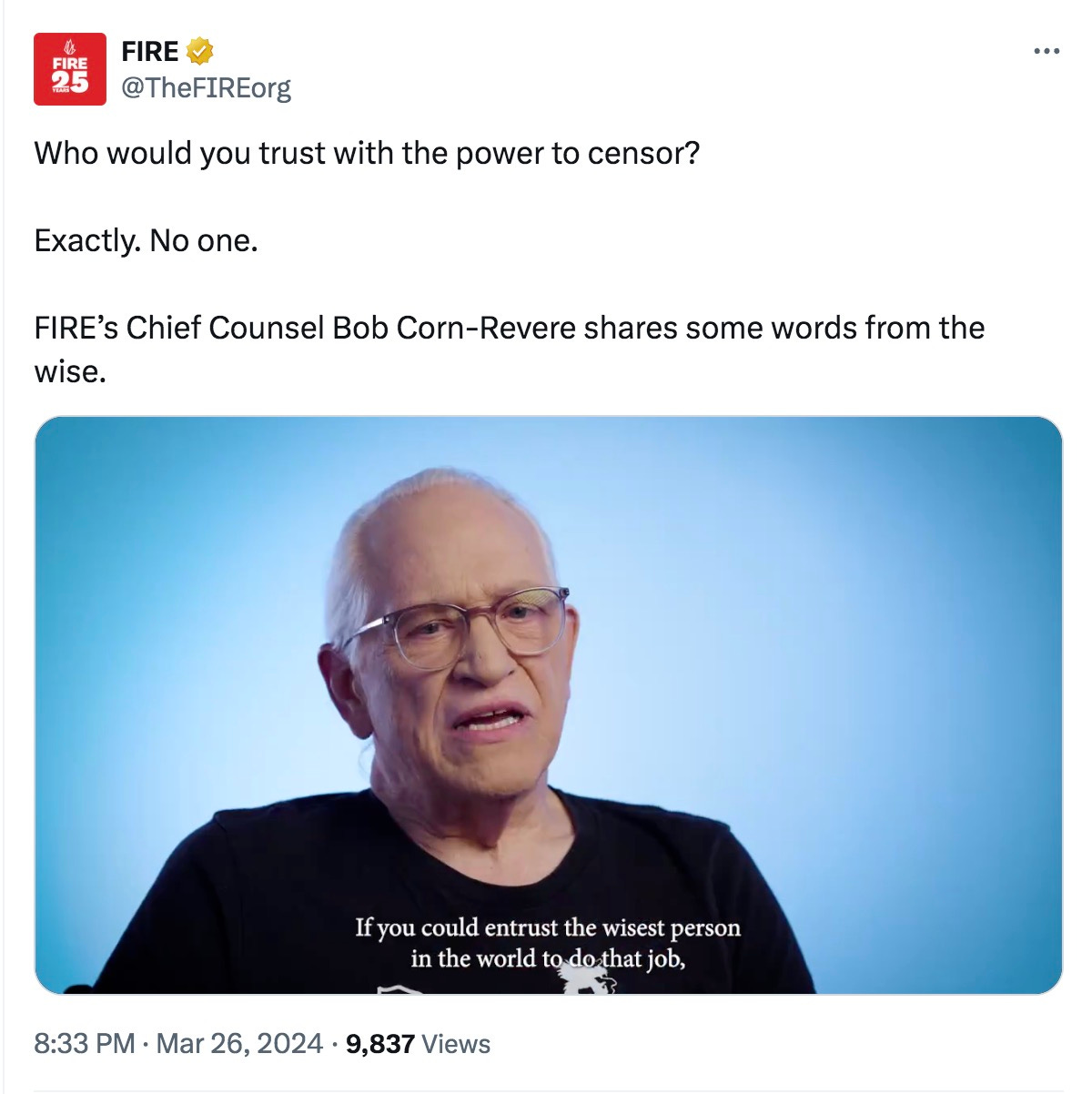 The Foundation for Individual Rights and Expression (FIRE) exists to help secure, not surprisingly, individual rights and expression. The Founders of this country made it clear that the government can be a threat to freedom by making the First Amendment a bulwark against that power. While outright censorship is often obvious, other forms can be more subtle, and FIRE addresses one such method: jawboning.