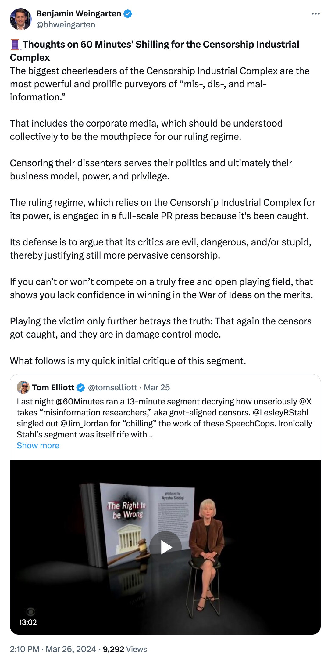 This tweet from Benjamin Weingarten introduces a much longer thread analyzing a 60 Minutes (CBS) segment on X (Twitter) and “misinformation.” Click for the whole thing.