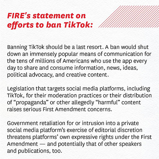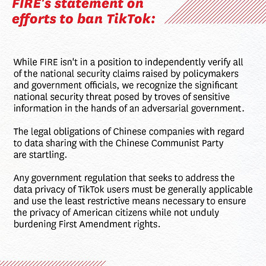 So what about banning TikTok? The Foundation for Individual Rights and Expression and David French say it depends on the reasons: