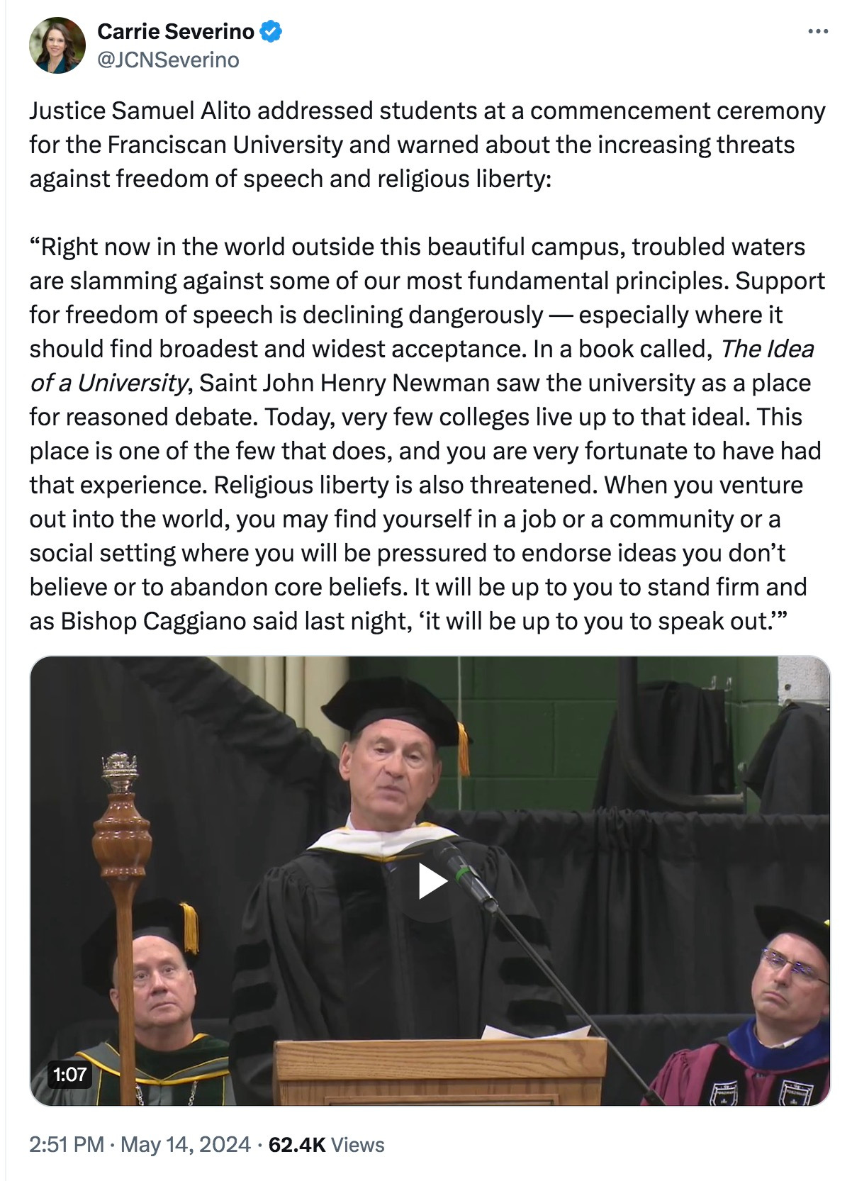 Samuel Alito on freedom of speech and religious liberty from a recent commencement address. Click for video.
