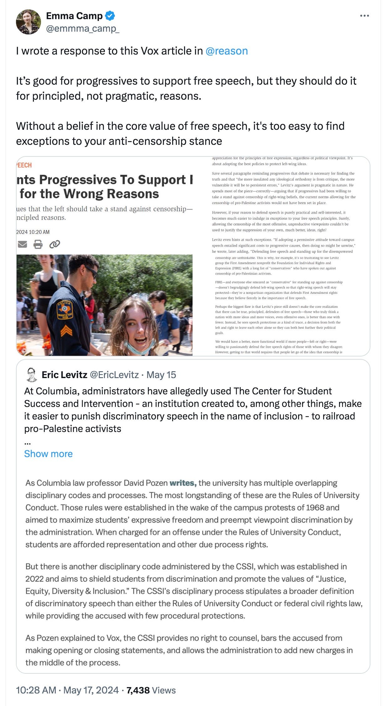 Emma Camp of Reason addresses pragmatic versus principled support of free speech: