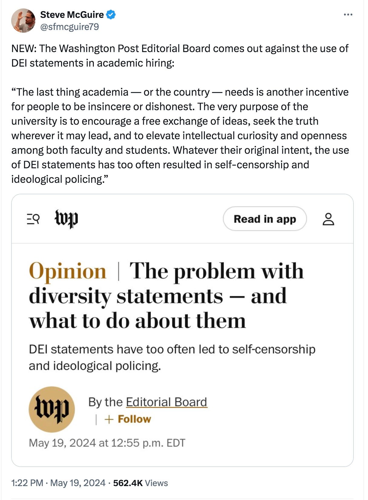 Via Steve McGuire, will wonders never cease? The editorial board of the Washington Post comes out against DEI statements: