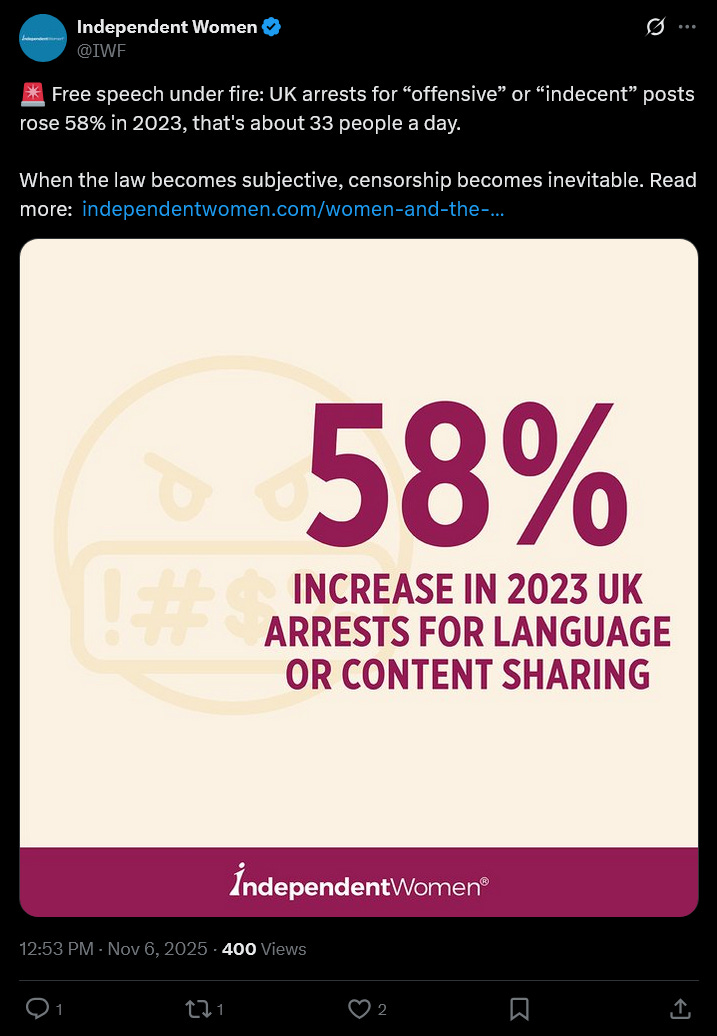 Independent Women’s Forum confirms the UK’s censorship problem is widespread and growing: