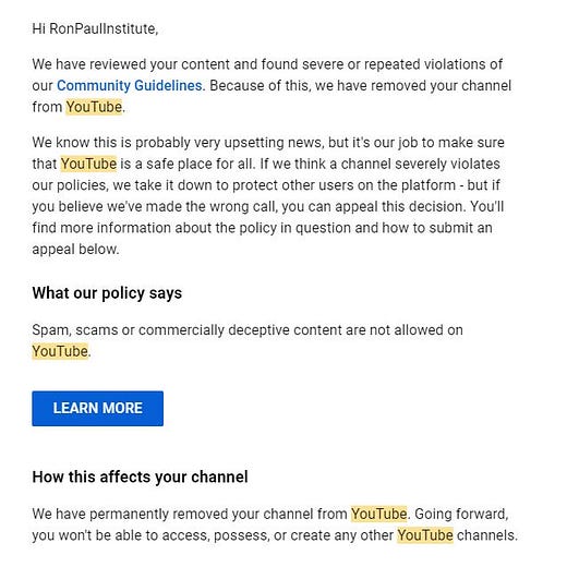Youtube briefly removed Ron Paul’s “Ron Paul Institute,” later reinstating it after calling the removal a “mistake”: