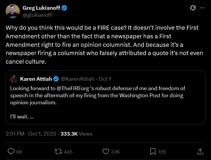 Former Washington Post opinion columnist Karen Attiah was unceremoniously fired last month for misquoting Charlie Kirk after his assassination. She then publicly chastised the Foundation for Individual Rights and Expression (FIRE) for failing to defend her. FIRE president Greg Lukianoff wasn’t having it: