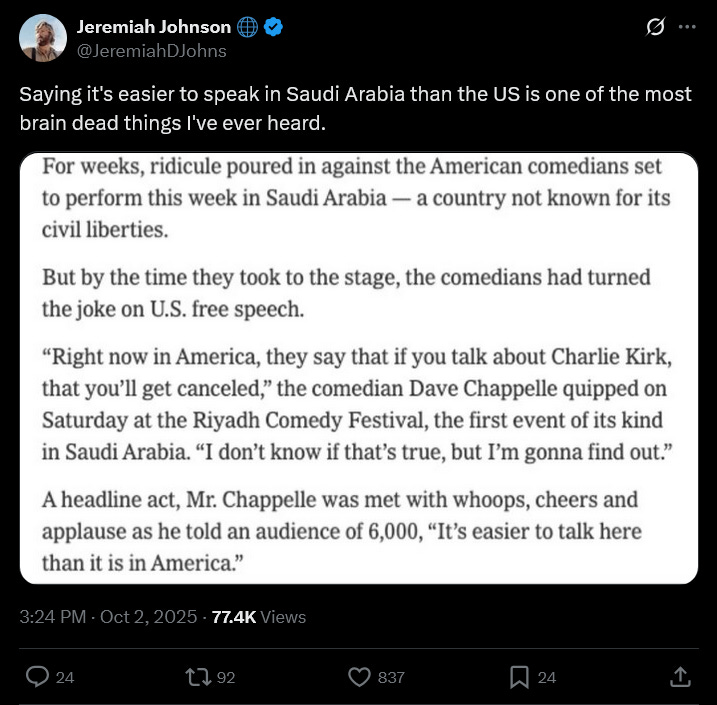 America has a fair-weather relationship with free speech, certainly. But are we more censorious than a theocracy like Saudi Arabia? Comedian Dave Chappelle seems to think so. Jeremiah Johnson says the funny man needs to have his head examined.