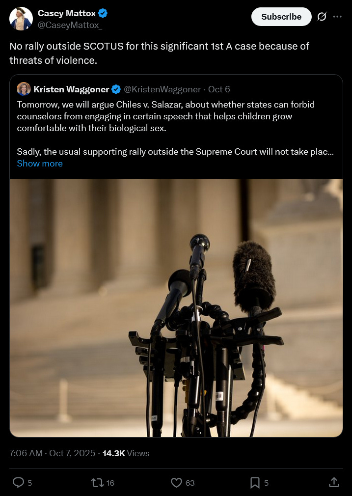 Yesterday the Supreme Court heard oral arguments in Chiles v. Salazar, a case challenging Colorado’s ban on so-called “conversion therapy.” A free speech rally in support of plaintiff Kaley Chiles was scheduled to occur before the proceedings, but was abruptly canceled due to credible threats of violence. The irony wasn’t lost on Casey Maddox.