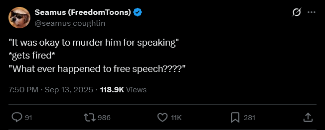 Seamus Coughlin, the animator behind the popular YouTube channel FreedomToons, sees a double standard at work. The same people who celebrated Kirk being murdered for his speech are now complaining about being fired for their own speech.