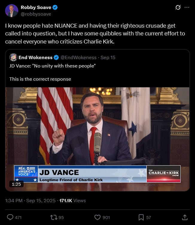 Echoing many free speech advocates, Reason’s Robby Soave is irritated with conservatives who are trying to use Kirk’s death to cancel their political opponents: