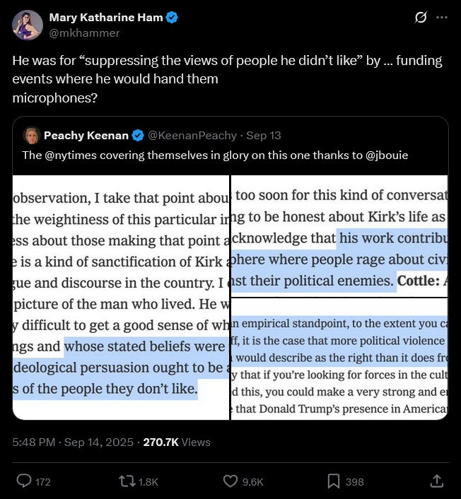 One of the strangest critiques leveled at Kirk, and by the New York Times no less, is that he tried to silence his political opponents. If that’s true, Mary Katharine Ham says he went about it all wrong: